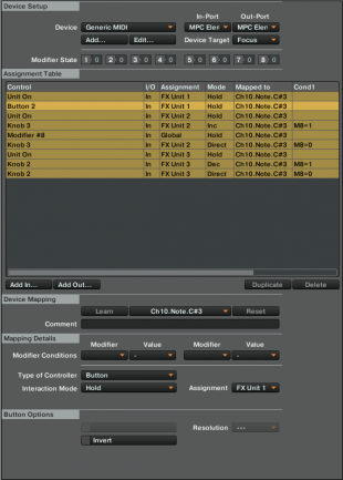 Haz Add In/FX Unit/Knob 2 , haz Learn y asigna la nueva entrada al mismo botón de las tres activaciones de efectos, y en Assignment selecciona FX Unit 1, con esto controlaremos el potenciómetro de Feedback. Type of Controller debes colocarlo en Button e Interaction Mode en Direct. Abajo en Set To Value escribe 0.850. Set to Value va desde 0.000 hasta 1.000, los decimales entre 0 y 1 indican la posición que tendrá el potenciómetro cuando pulses el botón. Ahora hacemos Add In/FX Unit/Button 2, hacemos Learn al mismo botón del controlador, Interaction Mode lo ponemos en Hold, y Assignment lo ponemos en FX Unit 1. Esto último controla el encendido y apagado de la función Freeze del efecto Delay, esta función del efecto es lo que detiene la música y deja sonando sólo el efecto; usamos siempre la opción Hold para que todo se desactive al soltar el botón.