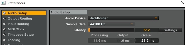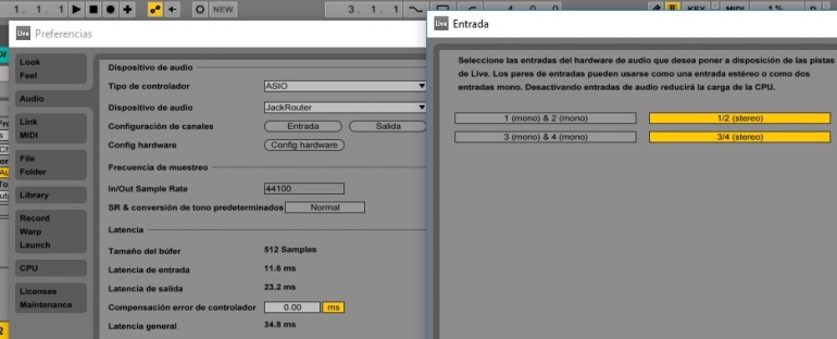 En Live vamos Preferencias y en Audio elegimos en Tipo de Controlador la opción ASIO, y en Dispositivo de audio, debemos seleccionar Jackrouter. En configuración de entrada y de salida activamos sólo los pares estéreo de Jackrouter. Creamos las pistas de audio en Live, y en la opción Audio From de cada pista elegimos Ext. In, y debajo en cada pista elegimos un par estéreo de entradas. En Monitor elegimos In en cada pista para que activemos la escucha del audio entrante. Nos falta un último paso.