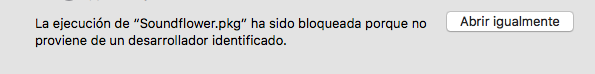 Al tratar de instalar Soundflower probablemente macOS nos lo impedirá con una advertencia de seguridad, indicando que no está hecho por un desarrollador identificado. Debemos abrir la aplicación de Preferencias del Sistema, dirigirnos a Seguridad y Privacidad y tendremos ahí mismo una opción para permitir ejecutar el instalador de Soundflower a pesar del impedimento inicial. Es seguro instalar la aplicación.