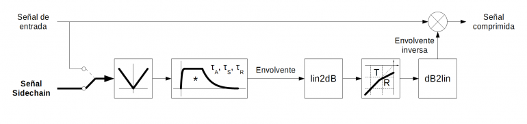 [Índice]El término tiene su origen en el tipo de compresión que lleva su nombre: compresión sidechain. Esta técnica emplea una señal distinta a la señal a comprimir en el detector de envolvente del compresor. En este esquema se muestra la configuración de un compresor feedforward con opción a sidechain: