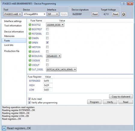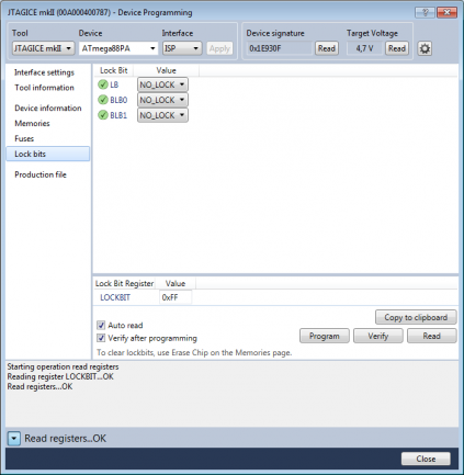Ir con cuidado al programar los fuses. Una configuración incorrecta puede hacer que el microcontrolador no funcione correctamente y en algunos casos que sea muy difícil, o incluso imposible, volver a programarlo. Los lock bits no deben tocarse, hacerlo puede dejar el microcontrolador bloqueado.