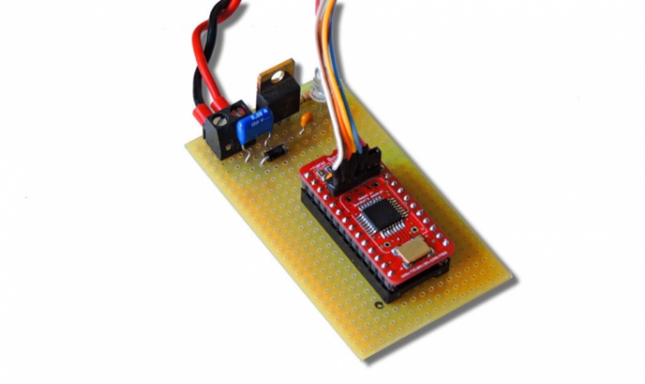 [Índice]Antes de programar el microcontrolador con el firmware, la placa del nano SwinSIDb montada, ha de conectarse al programador ISP con el cable adaptador citado anteriormente, y luego alimentarse con 5VDC (pin 14 a GND y pin 25 a 5VDC). Para programar las unidades que se muestran en las fotos de este tutorial cree una pequeña placa de alimentación con un regulador LM7805 pero existen alternativas más sencillas. Una opción bastante más simple es utilizar un zócalo ancho DIP de 28 pines, cortarle todos los pines menos el 14-GND y el 25-VCC y luego conectar el nano SwinSIDb con este zócalo al Commodore 64 o sintetizador SID para obtener los 5VDC.