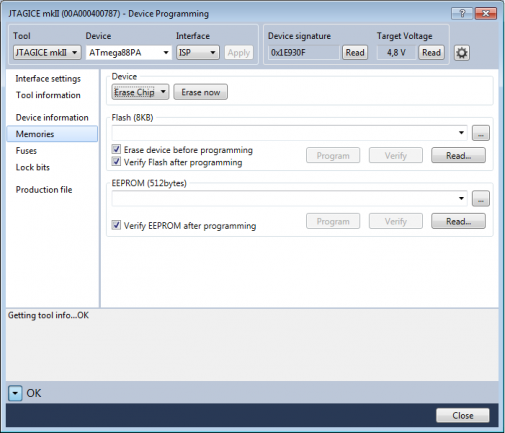 Existen varios programadores compatibles con el protocolo ISP de Atmel. En este tutorial se muestra un clon del JTAGICE mkII de Atmel, pero existen otros programadores más sencillos y baratos como el AVRISP que deberían funcionar igualmente. Si se quiere ahorrar dinero y se dispone de un ordenador con puerto paralelo, es posible construirse un programador sencillo con un conector DB25 y una par de resistencias.