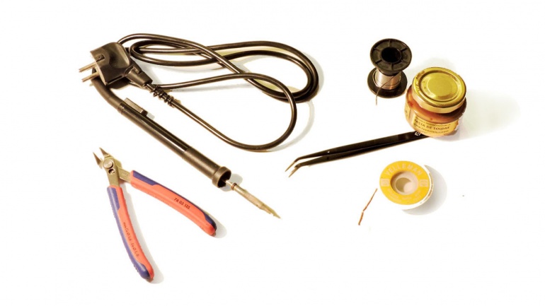 [Índice]Para soldar los componentes SMD es necesario un soldador de punta fina y de no mucha potencia (11 W son suficientes). También es necesario el hilo de estaño y unas pinzas para sujetar los componentes SMD sobre la placa mientras se sueldan. Es muy recomendable tener a mano malla de desoldar, flux y algún tipo de soporte para fijar la placa mientras se trabaja en ella.