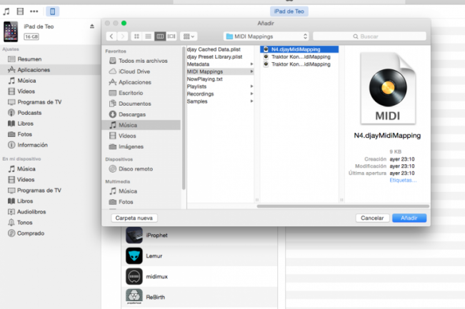 Los mapeos se guardan automáticamente en Música/Djay/MIDI Mappings, son archivos con la extensión .djaymidimapping y puedes abrirlos con cualquier editor de textos y ver su estructura, son archivos xml en los que si miras detenidamente no te costará distinguir los diferentes comandos y cómo están definidos, pero tranquilo, no te vamos a pedir que modifiques nada de esto. Comprueba que se ha creado el archivo con el nuevo mapeo de tu controlador y abre iTunes, conecta tu iPad –si lo sincronizas por WiFi no es necesario–, haz click en el dispositivo en iTunes para ver su contenido y dirígete a la pestaña Aplicaciones. Baja hasta “Archivos compartidos”, selecciona la aplicación Djay 2 en la parte izquierda y en la parte derecha haz click en el botón Añadir. En la ventana que se abrirá localiza el archivo con el mapeo que has creado con Djay para OSX para transferirlo al iPad.