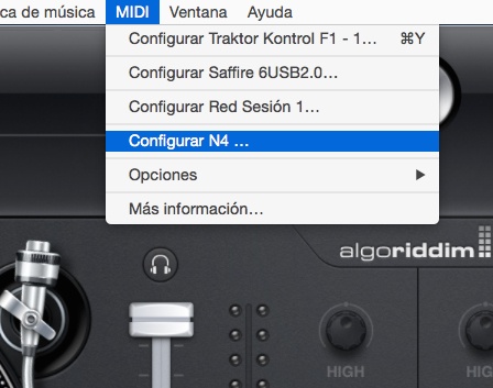 Lo primero que tendrás que hacer es conectar tu controlador al Mac y esperar que sea reconocido. Después abre Djay para OSX y en el menú superior MIDI, si tu controlador ha sido detectado con éxito, aparecerá la opción “Configurar…” junto al nombre del controlador. Pulsa ahí y se abrirá la ventana de mapeo del controlador.