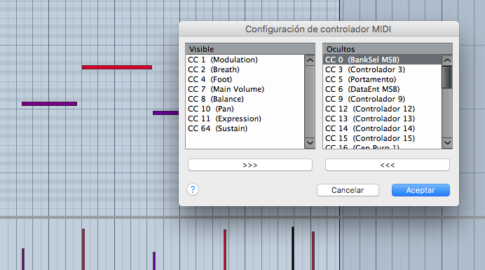 Como sólo está la edición en pianola, hay que ir a la parte inferior, que permite mostrar/editar mensajes de cosas que no sean notas. Por defecto sólo permite elegir entre unos pocos mensajes, pero con ‘configurar’ podéis añadir los que faltan: CC0 (bank select MSB) y CC32 (bank select LSB).