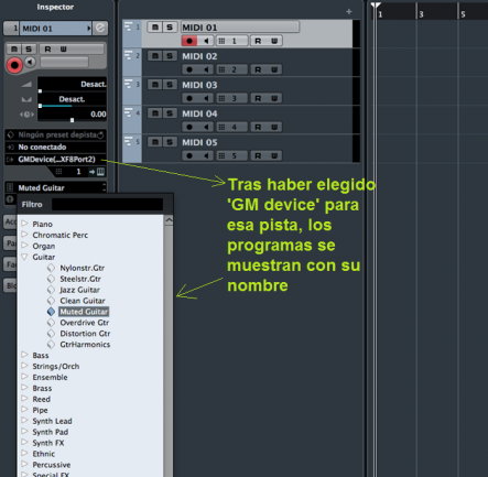 Cuando hemos establecido qué sinte/lista de sonidos es la que estamos usando para una pista, en lugar de ver como antes banco y programa por nº lo que veremos es una lista, a menudo clasificada ya sea por familias de instrumentos (como en el ejemplo de GM) o por bancos del sinte (preset1, preset2, user1, user2, etc.)