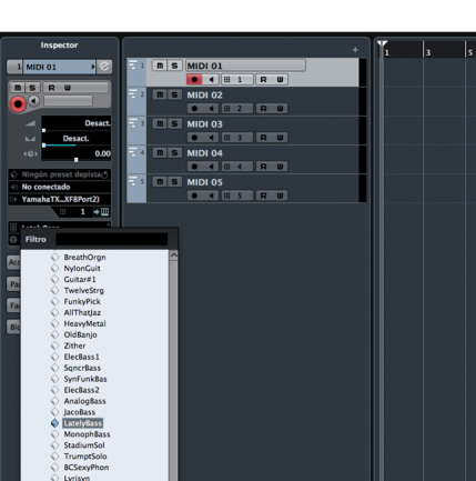 La lista que muestra en este caso Cubase está organizada por familias de instrumentos recopilando sonidos de varios bancos, en lugar de mostrar el contenido de cada banco en bruto.
