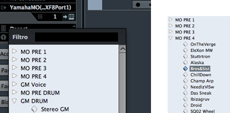 En este otro ejemplo, con un MO de Yamaha, los nombres ‘MO PRE1’…’PRE4’ corresponden a varios juegos de sonidos distintos y propios de ese sinte (cada uno de ellos con 128 sonidos posibles) y ‘GM Voice’ es el juego de 128 sonidos GM. Veis además que podemos seleccionar incluso entre voces normales o de juegos de batería: ‘MO PRE DRUM’ son juegos de sonidos de batería propios de MO y no falta el ‘GM DRUM’ que en este caso tiene un único juego (Stereo GM).