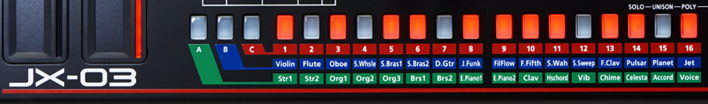Si vais al panel del JX-03 (versión Boutique del JX-3P) veréis dos secciones (A y B) de sonidos prefijados y una tercera (C) de sonidos programables por el usuario. Cada una con 16 programas, y por tanto un total de 48 sonidos.