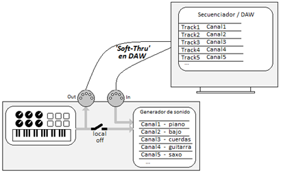 Los sistemas DAW permiten activar la función ‘soft-thru’ por la cualquier información MIDI que se recibe en el puerto MIDI In asociado a la pista que está seleccionada en cada momento se copia hacia la salida MIDI que corresponde a esa pista, pero asegurando previamente que se ‘recoloca’ en el canal que esté especificado para uso por esa pista. Esa función 'Soft-thru' nos cubre el papel del cable que situaba en la figura anterior, pero con el valor extra de esa reasignación del nº de canal.