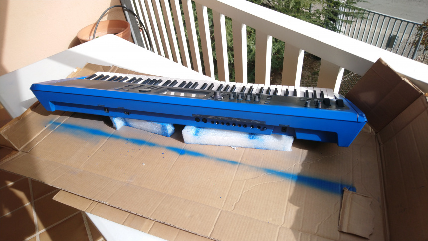 Teniendo varios teclados de color negro, quería quitarme la sensación de 'luto'. Y aprovechando que un MODX que compré usado estaba algo deteriorado, me animé a personalizarlo. En este tutorial 'bricosónico' os presento mi MODX Blue Edition. Se trata realmente de la primera etapa dentro de una transformación mayor. Así que, me veréis volver sobre el tema del 'tuning' otro día, porque el aspecto con que veréis que acaba esta sesión de pintura, aunque es adecuado y aparenta estar finalizado, no será el definitivo. Es lo que tienen las operaciones de estética... Una vez hecha la primera, ya piensas en la segunda.