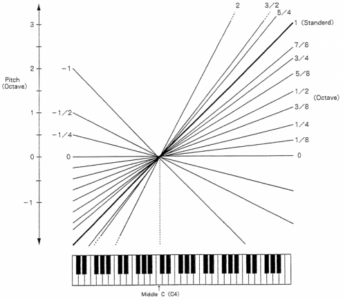 Otro aspecto, tan a menudo desatendido, que siempre encuentro muy importante en el uso de sintetizadores, como es la capacidad de usar un keyscaling ambicioso que además de seleccionar una determinada pendiente ‘global’ pueda enfocar su acción sólo a partir de cierto punto del teclado, también estaba previsto. De hecho, en lugar de una única ‘ley’ de keyscaling, el D-50 aplica diferentes esquemas que se adaptan mejor a cada uso (nivel, frecuencia de corte, afinación) y que incluso aplican reglas muy específicas (no representadas en estas figuras) como algunas curvas capaces de crear el estiramiento de tono (stretching) propio de la afinación habitual en el piano acústico.