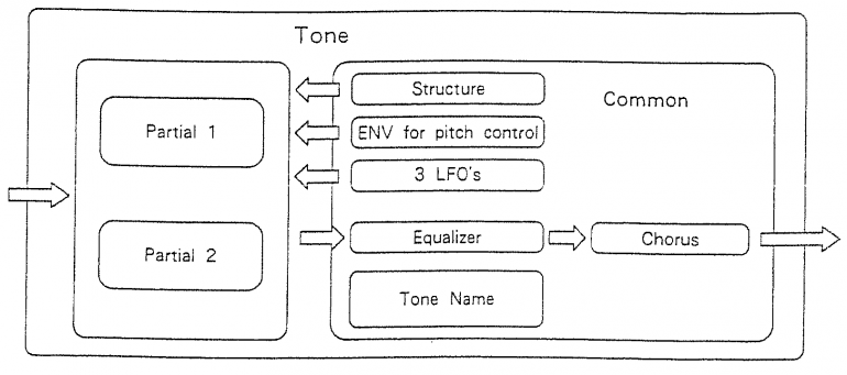 Son dos parciales más algunos recursos comunes a ambos. Cada uno de los parciales, individualmente, podía ser configurado entre dos modos de funcionamiento: ‘PCM’ (muestreo) o ‘Sintetizador’ (una cadena oscilador/filtro/amplificador). Cada uno de los parciales cuenta con sus propios recursos que enseguida veremos. En común para uso por ambos existe un juego de 3 LFOs. También hay una envolvente compartida para ‘Pitch’, y un juego de efectos de inserción formado por una cadena de EQ y retardo corto modulable. Además de esos efectos, existe en el D-50 una reverb programable global, que actúa para los dos ‘tones’.