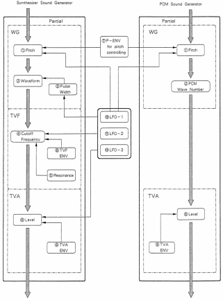 [Índice]El modo ‘Synth’ incluye la clásica cadena sustractiva de oscilador->filtro->amplificador, aquí llamados WG (wave generador), TVF (Time Variable Filter) y TVA (Time Variable Amplifier). En TVF y TVA sendas envolventes se encargan del carácter variante a lo largo del desarrollo de cada nota. El filtro, pese a ser digital, no renuncia al control de resonancia (una ausencia que sí sufría el posterior M1 de Korg, comparativamente mucho menos versátil como sinte, y cuyo éxito es más el de su carácter de ‘workstation’, con multimuestras extensas, secuenciador, multitimbralidad, mapas de batería/percusión, etc.). En este modo 'sinte', el WG es un generador de onda cuadrada de anchura variable y diente de sierra. Poco importa que el diente fuera generado a partir de la cuadrada en combinación con el filtrado posterior, un truco que hacía más simple el sistema (el oscilador es estrictamente cuadrado / binario y por tanto digital en esencia). Desde luego está lejos de cualquier idea de ‘modelado analógico detallado’ actual, pero con sus pros y sus contras técnicos, en aquellos años era clave para hacer posible un sistema así.