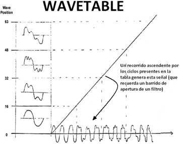 En los osciladores look-up table es un D/A alimentado con las sucesivas muestras de un ciclo de la señal deseada la forma en la que generamos esa oscilación repetitiva, ya sea rectangular, diente… Pero si podemos extraer de una memoria la ‘forma’ de la señal que ha de producir el oscilador… ¿porqué no hacer que en lugar de una forma fija haya un pequeño juego de formas, y que la variedad tímbrica se consiga visitando esa colección de formas almacenadas, pasando de unas a otras? Estamos ante una ‘wavetable’.