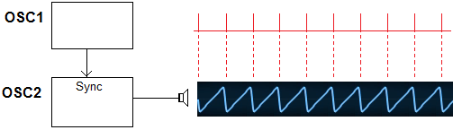 Pensemos pues es un oscilador 1 del que, al menos inicialmente, no vamos a escuchar su salida audio. Lo queremos sólo para que obligue a un oscilador 2 a reiniciarse. Como no vamos a escuchar a osc1, no nos importa su forma de onda, así que representaré sólo los instantes en los que arranca. Son esos instantes de arranque del oscilador maestro los se usan para disparar el arranque del esclavo. Si ambos están afinados aproximadamente a la misma frecuencia, la activación de la sincronización dará lugar a que ese ‘aproximadamente’ se convierta en ‘exactamente’. Sea cual sea la desafinación del osc2, se verá obligado o arrastrado a replicar la frecuencia del oscilador 1.