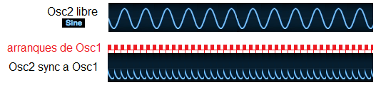 Por ejemplo Osc2 está afinado por debajo de Osc1 (o al revés Osc1 más alto que Osc2): en un ciclo del maestro sólo entra un fragmento del ciclo del esclavo. Como resultado tenemos una modificación muy importante de la forma de onda que está produciendo el oscilador esclavo. Lo ilustra esta figura: