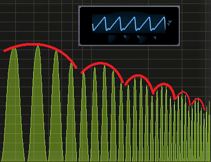 Claramente deja de ser un seno y habrá una señal con un espectro que presenta varios armónicos. De hecho la abrupta transición que se produce en cada ciclo nos habla de un espectro brillante, un sonido rasposo, generoso en la presencia de energía sobre los armónicos. La salida de nuestro oscilador ‘senoidal’ pasa a presentar una señal rica en contenido espectral.