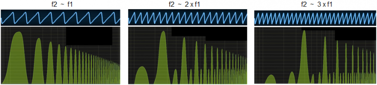 Cuando f2 es múltiplo de f1, esas resonancias se vuelven mucho más llamativas: justo recaen sobre alguno de los propios armónicos. Aquí veis un par de ejemplos (refuerzo de los armónicos pares y refuerzo de los armónicos tercero y sus múltiplos).