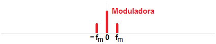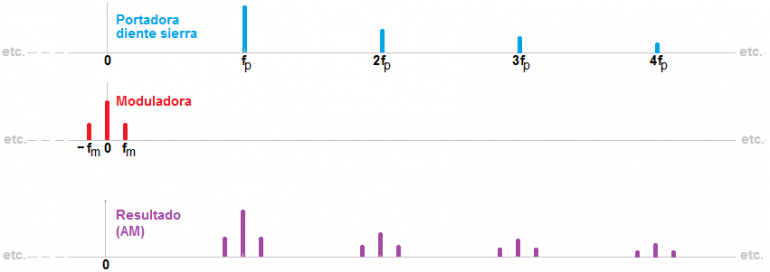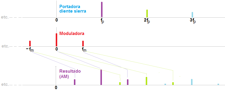 Desde el punto de vista práctico la convolución sitúa una réplica del espectro de la moduladora (las tres rayas) sobre cada una de las dos rayas del espectro de la portadora. Una ‘imagen’ del espectro de la moduladora va a ocupar el lugar de cada una de las rayas de la portadora. Cada raya de la portadora es sustituida por el espectro de la moduladora.