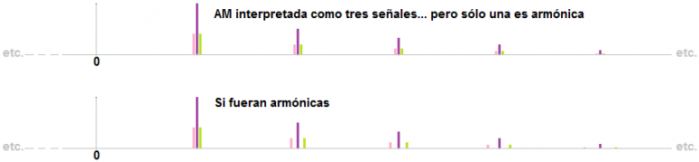 Si fueran tres señales armónicas, cada uno de los peines sería armónico y por tanto la distancia entre la raya principal y las laterales provocadas por la modulación tendría que ir creciendo con el orden del armónico (como os muestro también en la figura). Eso no nos pasa en la modulación AM. Si fueran armónicas sí tendríamos superpuestas varias señales de afinación muy próxima pero ligeramente diferente y sí habría un efecto chorus/unison. Sin embargo un trémolo no suena a eso. Suena… a trémolo, claro. Lo siento, AM, con señales dotadas de armónicos, no equivale a un chorus/unison.