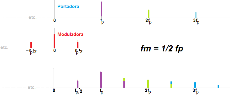 Si fm es 1/2 de fp, algunas de las rayas debidas a las réplicas del espectro de la moduladora ‘colisionan’ sobre la misma frecuencia (se superponen y suman). Intento hacerlo evidente con la coloración del dibujo. Pero lo que me interesa sobre todo es que veáis que para ese caso particular la nueva formación de las rayas es propia de un peine armónico. Es decir, el sonido que obtenemos no es de ‘campanas’ sino el que asociamos a una nota limpia con su distribución de armónicos, etc.