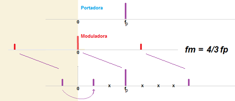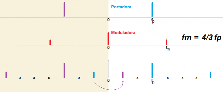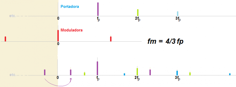 Por ejemplo si fm es 4/3 de fp también resulta una serie armónica. Lo ilustramos primero con senoides en la portadora. Vuelvo a pintar los dos lados del espectro completos, porque sucede algo en lo que tenemos que reparar: alguna de las rayas ‘cruza la frontera’ de la frecuencia cero, y va a caer ‘del otro lado’. Fijaos en la figura. De las tres rayas que como réplica del espectro modulador centramos en la componente ‘azul’ de la portadora hay una (la inferior) que ha ido a caer en fp-fm que en este caso es fp-(4/3)fp y por tanto se sitúa en –fp/3 que es una frecuencia negativa. Pero hemos de pensar que sucede otro tanto con la componente ‘morada’, que acaba generando una componente idéntica pero sobre fp/3 (positiva). Esto nos permite una forma de pensar el efecto de la convolución espectral basada en ‘reflejar’ las componentes que irían a parar en frecuencias negativas hacia las frecuencias positivas.