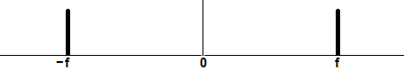 La portadora, ese seno cuya amplitud vamos a variar, tendría un espectro de ese tipo, porque era un seno puro: una raya a cada lado de ese espectro simétrico. Cuando pintamos sólo la parte positiva (que es lo que estamos acostumbrados a hacer) estamos obviando la parte negativa, porque sabemos a priori que va a ser la imagen especular. Pero en las modulaciones nos interesará tener en cuenta ambas.