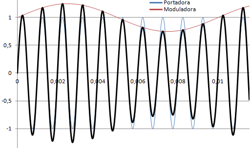 En el fondo, en la señal AM interviene la portadora original y el producto de los dos senos. El valor ‘I’ es lo que llamamos el índice de modulación y establece cómo de intensa es la contribución de ese producto que se suma a la portadora original. Cuanto mayor sea I, más intensamente modulada está la señal (más intenso será el trémolo). Si I llegara a ser mayor que 1, la señal ‘roja’ de la figura anterior cruzaría por debajo del nivel de amplitud cero, y eso daría lugar a que la portadora se invirtiera (pasaría a tener en algunos momentos amplitud ‘negativa’). Un detalle sobre el que volveremos al hablar de modulación en anillo, pero que hoy obviaremos. De momento nos quedaremos con I < 1, suficiente para que no suceda esa inversión.