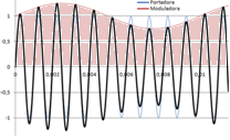 Vemos cómo, en la señal AM, la portadora se vé acompañada de esas rayas laterales a una distancia que depende de la frecuencia de la moduladora.