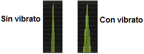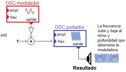 [Índice]Pensemos primero (al estilo de lo que le sucedió a J. Chowning) en algo que todos conocemos bien: el vibrato, o si lo preferís llevar a nuestro terreno, la aplicación de un LFO al ‘pitch’ en un sinte. Pensemos en una nota, por ejemplo un La 440Hz. La frecuencia del vibrato (de la modificación del tono) es a lo sumo de unos pocos Hz. y por tanto muy inferior a la frecuencia del propio tono que se ve modificado. También es importante considerar la intensidad del vibrato, que tiene que ver con la extensión del desplazamiento arriba/abajo sobre el valor original de 440. Un vibrato ligero puede estar subiendo unos pocos Hz, uno más intenso puede llegar incluso a ser de semitono o más (sucede en cantantes y en los momentos más arrebatados de un violinista).