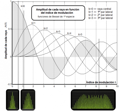 De hecho las amplitudes de los sucesivos parciales están descritas por las funciones de Bessel de 1ª especie y orden k, en función de la intensidad de la modulación, y aunque había prometido no pasarme del lado matemático, es demasiado bonito como para que no lo veais: