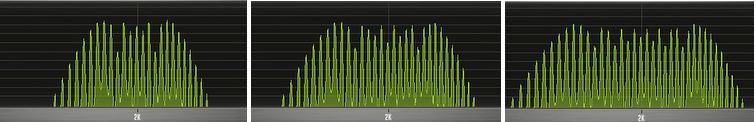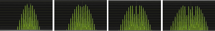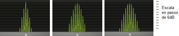 Fijaos cómo las rayas centrales (antes las más preeminentes) pierden primero fuerza respecto a otras, y luego se van produciendo otras diversas distribuciones con picos y valles en la zona central. En todas ellas los extremos de la banda ocupada sí son ‘decrecientes’ pero la actividad en la zona central tiene un comportamiento muy dinámico, con mucho movimiento, con mucha cesión de energía entre unos armónicos y otros. Con ‘huecos’ que se abren sobre una zona central en la que se concentran los armónicos más fuertes. Recordad que es una escala en dB, así que las diferencias de nivel son realmente fuertes, y en particular los armónicos finales de cada lado están muy rebajados ya.