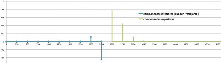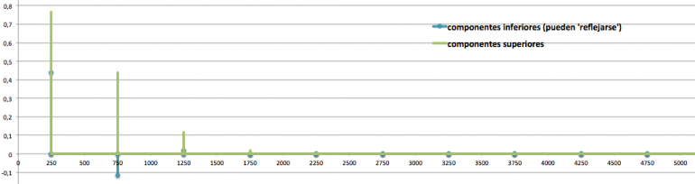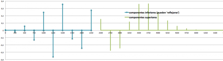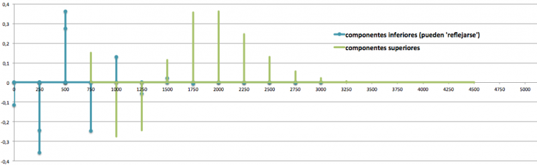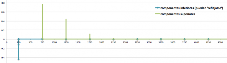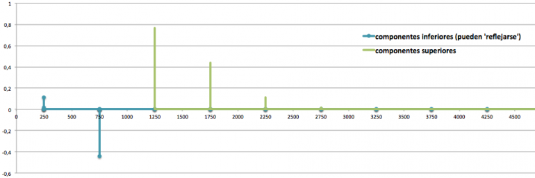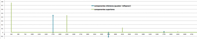 Para los resultados hacia abajo se llegan a producir valores negativos (seguiríamos con 200, 0, -200, -400, etc.). Podemos pensar en que sucede una especie de ‘reflexión’ que lleva esas contribuciones a frecuencias positivas (lo mismo que comentamos en AM). Así lo que debería ir a -200 o -400 acabará ocupando 200 y 400. Si se solapan en una frecuencia una componente ‘original’ y una ‘reflejada’ se suman o restan (si su amplitud es del mismo signo se refuerzan, en caso contrario el resultado es a la baja).