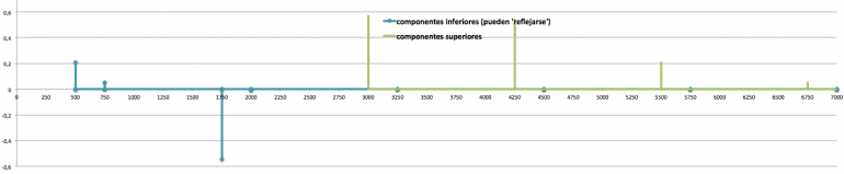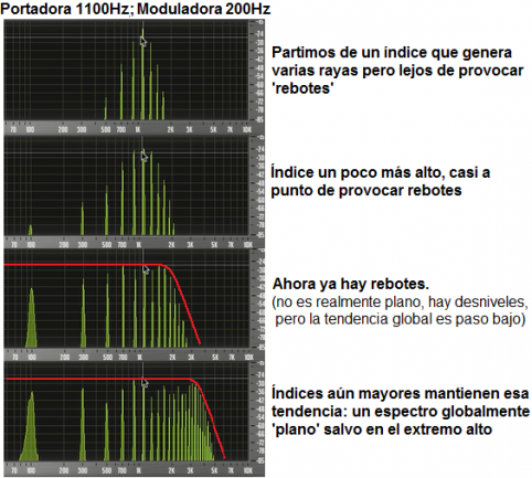 Como podéis ver en la siguiente figura, el efecto de estas reflexiones globalmente suele contribuir a homogenizar el nivel de los armónicos que están por debajo de la portadora, evitando así que sea un espectro de ‘montaña’ y devolviéndonos a un territorio más de tipo ‘paso bajo’. Que os quede la idea de un espectro ‘lleno’ hacia abajo, de corte global ‘paso bajo’, aunque no sea plano y tenga fuertes desniveles internos.