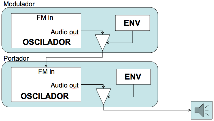 La arquitectura en los Yamaha DX y tantos otros sintes FM se basa en el juego de osciladores senoidales en el que uno actúa como ‘modulador’ (modulator) de la frecuencia de otro que actúa como ‘portador’ (carrier). Para evitar que el sonido sea ‘estático’ cada oscilador cuenta con su propia envolvente que permite variar su nivel a lo largo del tiempo. Sería algo así: