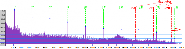 Pero si nos centramos en valorar el esfuerzo de Arturia (dando crédito a estas gráficas) habría que aplaudirlo. Está claro es que si no se corta la serie de forma temprana existe el peligro de que aparezcan componentes altas que puedan provocar aliasing (lo que sí hubiera sido muy apreciable a pesar de esos bajos niveles). Es mejor diseño imitar los primeros y más prominentes productos de la distorsión que pretender extenderlos y con ello introducir aliasing.