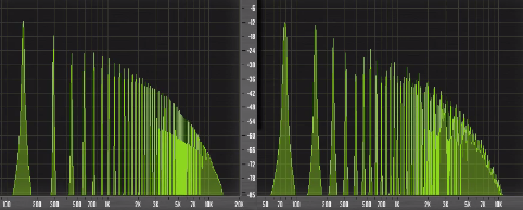 Imponer una respuesta de tipo ‘peine’ sobre la regularidad extrema de la caída progresiva de los armónicos en un diente filtrado es una forma de recuperar una mayor riqueza y variedad. Sin ser tan agradablemente caótica como la distribución de los realces que veíamos en el violín, la imposición de una respuesta en peine sí nos permite evitar la caída monótona de nivel de los armónicos en el diente. Introduce realcen y valles que, en su justa medida, llegan a resultar agradables.
