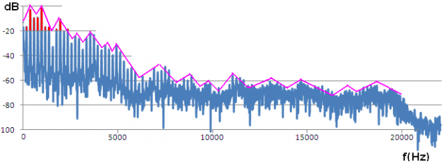 En un diente de sierra, la intensidad de los armónicos a lo largo de la serie armónica cae unos 6dB por octava. Cada armónico es más fuerte que el siguiente, hay una traza global monótona, de caída continua de nivel. Y eso huele a artificial por los cuatro costados. Su espectro es tan regular que nuestro oído fácilmente descubre esa regularidad y en cierta forma se aburre. No encuentra la riqueza y contrastes que sí presentan los sonidos ‘reales’ que está acostumbrado a lidiar en el día a día.
