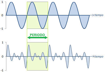 El periodo (T) mide lo que dura cada ciclo de esa señal repetitiva. Es una medida de tiempo y por tanto en unidades de segundo (o alguna fracción como milisegundos). Esta figura representa dos señales con diferencias importantes en la forma de onda (una sinusoide, la otra más compleja) pero que tienen un mismo periodo.