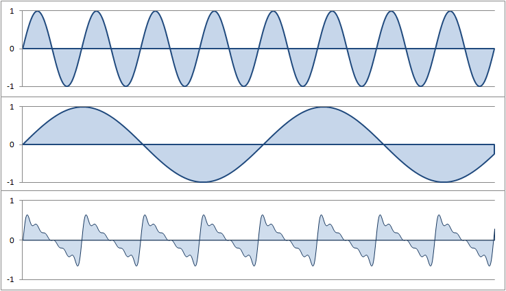 [Índice]El hecho demostrable de que otras formas de señal puedan describirse acudiendo a una combinación de sinusoides hace que las consideremos como la forma más simple posible en una onda, en tanto que las demás pueden ‘reconstruirse’ por agregación de múltiples sinusoidales. Por ello se llaman también tonos puros.