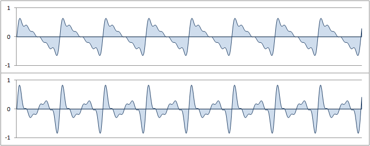 Para ilustrarlo aquí tenéis un ejemplo. El resultado de sumar los seis primeros parciales con las mismas amplitudes que permitían generar el diente de sierra, pero anulando totalmente la presencia del fundamental, comparado con el resultado cuando sí está presente. Hay evidentemente una diferencia en la forma de onda, pero no en el periodo ni por tanto en la frecuencia que manifiesta la combinación, que sigue siendo la misma y que corresponde a la del fundamental.