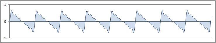 En el caso de que A1=A0/2; A2=A0/3; A3=A0/4, … (es decir, una caída progresiva hacia niveles cada vez más bajos con esa regla de amplitudes) la forma de onda obtenida resultante tiende hacia una rampa, y la sucesión de varios ciclos parece formar el contorno de la hoja de un serrucho. De hecho se habla de forma de onda en ‘diente de sierra’ (tanto más perfecta cuantos más componentes añadamos). Esta gráfica muestra el resultado con sólo los seis primeros componentes.