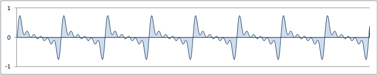 Tampoco es habitual, salvo como efecto, excitar la cuerda muy cerca ya de su final, casi sobre el puente, porque en ese caso además de ser difícil poner en movimiento la cuerda y conseguir trasladar a ella suficiente energía, hay muy escasa diferencia entre el nivel de energía que reciben todos los primeros parciales, y eso hace que el sonido pierda cuerpo y solidez. Aquí tenéis el resultado de sumar los seis primeros parciales con amplitudes sólo un 10% más baja en cada uno respecto al anterior, que muestra una tendencia hacia forma de ‘pulso’ breve que sube y baja rápidamente en un tiempo corto permaneciendo el resto del ciclo en niveles bajos.