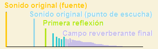 Además el sonido original normalmente no será un impulso sino de una duración determinada. En ese caso, y obviando el sonido original en la fuente (naranja), lo primero que escuchamos es su versión ‘azul’ en la figura, correspondiente al sonido que alcanza directamente al punto de escucha. De las primeras reflexiones (representadas en verde) podemos concebir igualmente que son una copia retrasada respecto a la original y si el nivel del sonido original era constante, lo será también en cada una de esas copias individuales que llamamos reflexiones tempranas.