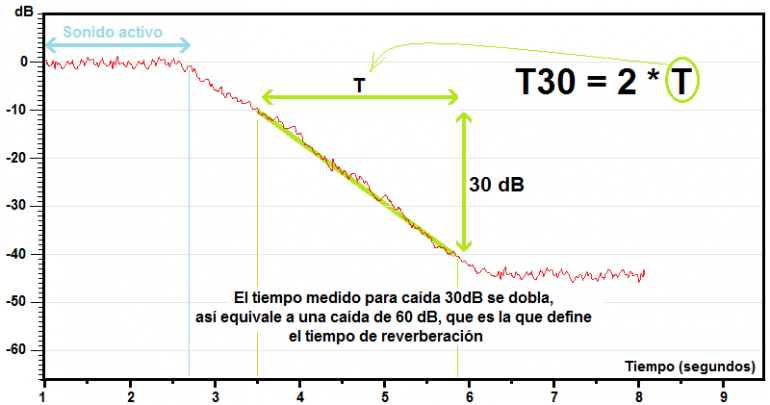 En la figura veis un ejemplo. Se ha reproducido una fuente sonora (es habitual usar ruido blanco). De hecho en la figura he situado el nivel referencia de 0dB en aquel que existe mientras está produciéndose sonido. No nos importa cuál sea ese nivel, porque sólo buscamos medir la diferencia, la caída de nivel posterior.