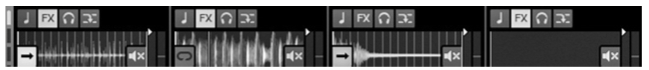 [Índice]Existen toda una serie de parámetros que afectan de forma independiente a cada uno de los 4 slots de reproducción y que pueden ser asignados a comandos de mapeo. Estos están representados en estos iconos situados en la parte superior de cada nicho y sólo son visibles al pasar el botón del ratón sobre esa zona de pantalla.
