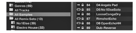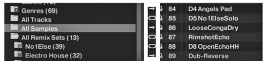 En el Browser se utilizan símbolos tanto para diferenciar las muestras de las canciones normales, como entre ellas mismas. Además una carpeta especial llamada All Samples agrupa todos los elementos de la colección que hayan sido marcados como muestras al importarlos.